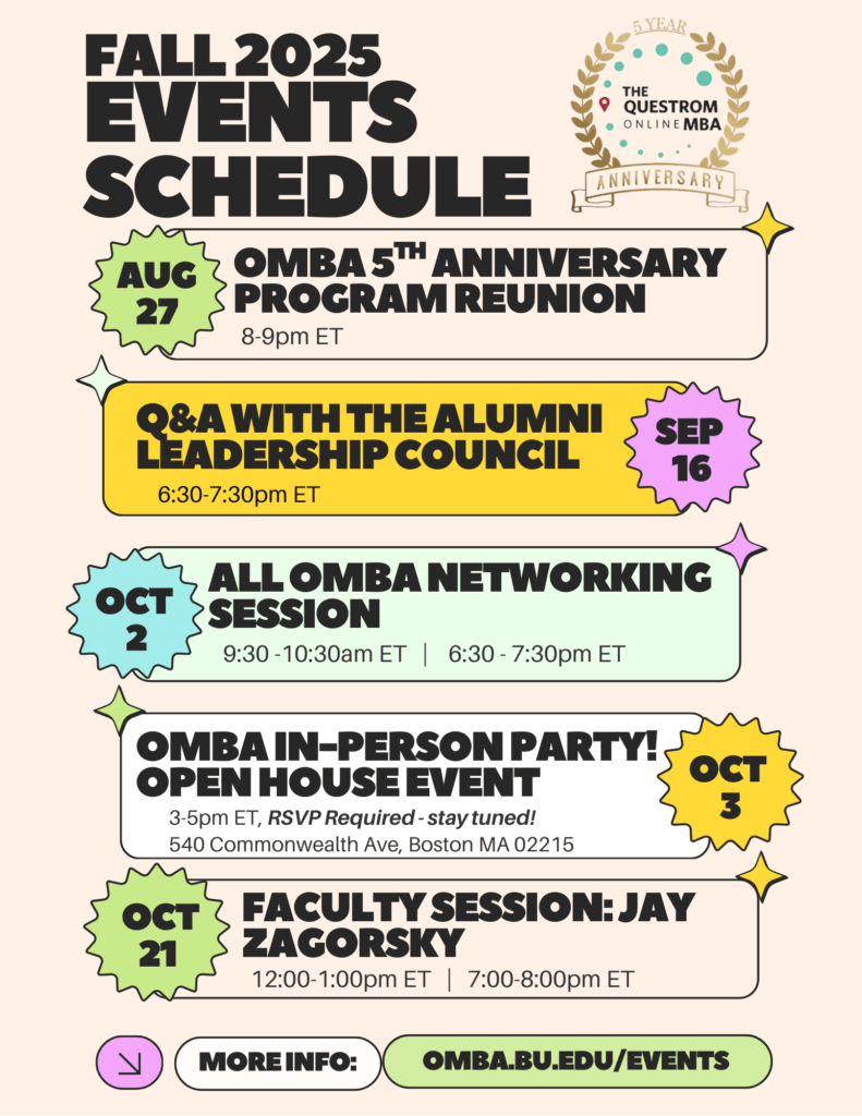 OMBA is excited to celebrate its 5th year of operations during the Fall 2025 semester! To commemorate this milestone, we invite all alumni, faculty, staff, and students to join the Success Team for a series of events throughout the fall semester. Check out the full schedule of events below. We are excited to see everyone at our upcoming events!